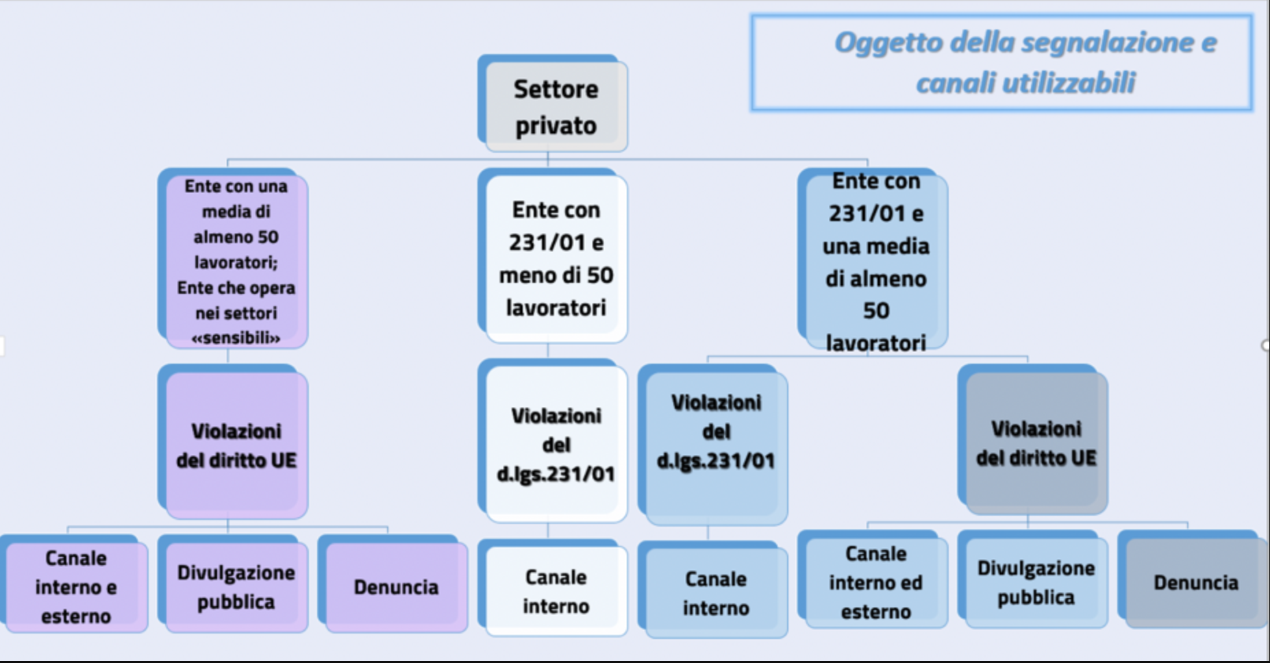Il decreto differenzia l’oggetto della segnalazione in relazione alle caratteristiche dei soggetti giuridici coinvolti, nella tabella che segue è rappresentato sinteticamente cosa può essere segnalato e con quali canali:
